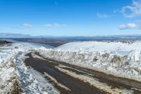 This is an image of a snowy road in the New Zealand landscape. The snow-covered ground and mountains in the background create a picturesque view. The snowy conditions make this road wet and potentially dangerous for driving. The gravel surface adds to the rugged nature of the scene. This photo captures the recreational opportunities of the area, with an overview of the surrounding hills and water. A day in New Zealand offers stunning views and opportunities for outdoor activities in the snowy landscape.