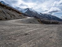 This is an image of a dirt road in New Zealand, curving along the mountain side. The road is made of gravel and sand, with low clouds hanging overhead. In the distance, snow-covered mountains can be seen on both sides. This photo captures the beautiful scenery and rugged terrain of New Zealand's mountains. The contrast between the dirt road and the snow-capped peaks creates a striking image. It represents a typical day in New Zealand's mountainous regions.