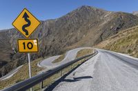 A scenic road in New Zealand's South Island, winding through the majestic mountain range. The yellow curve sign stands out against the clear sky, guiding drivers through the S-curve. The Armco barrier provides safety on this exhilarating mountain pass.