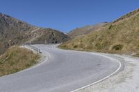 A scenic road in New Zealand's South Island winding through the majestic mountains. The smooth asphalt surface is surrounded by breathtaking highland landscapes. Clear skies and Armco barriers add to the allure of this picturesque highway.