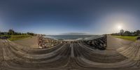 A fish-eye view of a beach and the ocean from a viewpoint on the North Island of New Zealand. The coastal landscape features calm azure waters and a wooden boardwalk leading to a pier. The concrete jetty provides a recreational spot to enjoy the natural environment.