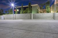 A night view of the cityscape in Los Angeles, California. Modern architecture and concrete streets contrast with the darkness. Street lights illuminate the roads and bus stops, creating a vibrant urban atmosphere.