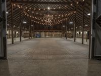 a large barn is lit up for dinner and event events with lights hanging from the ceiling