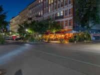 Night scene in Berlin, Germany. Classic architecture merges with modern urban design. Street lights illuminate the city streets, showcasing storefronts, cafes, and residential houses. A quintessential European city life experience.