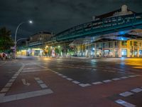 Nighttime in Berlin, the city comes alive with artificial light. Bridges and underpasses illuminate urban roads. Traffic lights and street lights guide city life in Europe. A blend of open spaces and urban design.