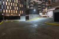 a parking garage and some high rise buildings at night with yellow pipes running through it