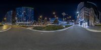 this is a fish eye lens that displays a view of a city intersection at night