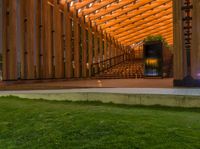 This image captures the unique urban design and architecture of a wooden building at night. The wooden floor and stairs contrast with the greenery of the grass inside the building. The top half of the building is illuminated with artificial lights, creating a magical atmosphere. With the clear sky above, the dark night highlights the low, ambient light from the street lights. This photo represents the beauty of city life and the fusion of natural and man-made elements in urban environments.