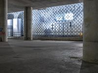 This is an image of a modern architecture building in Berlin, Germany. The city's urban design is evident with street lights illuminating the dark surroundings. The building is made of concrete and metal, with large windows showcasing the lighted rooms inside. The parking deck below provides open space and adds to the urban atmosphere. This photo captures the essence of city life in Europe, where modern architecture meets the urban landscape. The surface of the concrete floor and the bridge in the background contribute to the overall aesthetic of the image.
