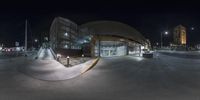 a fisheye lens image shows a city street at night, as a car sits parked in the parking lot