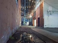 A view of a city street at night. The road stretches straight ahead, lined with asphalt and illuminated by artificial lights. Wet surfaces reflect the lights, creating an urban atmosphere. Infrastructure and buildings create a wall on either side of the road.