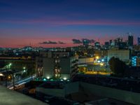 This is a captivating image of a city skyline at night. The vibrant cityscape is illuminated by the glow of neon lights, street lights, and artificial light from skyscrapers. The dark sky with clouds overhead creates a dramatic contrast. The elevated perspective offers a bird's eye view of the urban landscape, showcasing the high-rise buildings and the open spaces in between. This photo captures the essence of city life, showcasing the urban design and the unique atmosphere that comes alive at night.