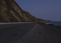 A night drive along the Pacific Coast Highway in California, USA. The road cuts through the coastal landscape with stunning views of the ocean and mountains. Clear skies illuminate the dark terrain.