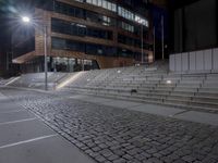 A view of Hamburg's HafenCity business district at night, with a city street lined with stairs and a building brightly lit. During the day, the area is bustling with activity and offers a clear view of the stunning architecture.