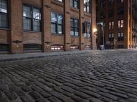 This is an image of a classic urban street in Manhattan, New York City. The picture captures the architectural beauty and the vibrant atmosphere of the city at night. The buildings and walls are illuminated by street lights, casting a warm and artificial light onto the town. The cobblestone road surface gives the street a timeless charm. This photo depicts the unique infrastructure and public spaces found in New York City, specifically in the neighborhood. It showcases the dark yet enchanting ambiance of the city at night.