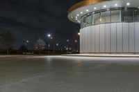 This is an image of a modern high-rise office building in the city of Toronto, Canada. The architecture features a sleek and low facade made of composite materials. The building is illuminated by artificial light, giving it a dramatic look against the dark sky. The open space in front of the building includes a road surface and a bus stop. This photo captures the essence of city life in Toronto, with its urban design and contemporary buildings. It represents the modern and vibrant atmosphere of the city.