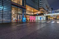 a city street with a storefront near by and buildings at night lights from windows