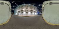 A captivating night view of Miami Beach, Florida. The fish-eye lens captures the circular street scene, showcasing the vibrant city life. Neon lights illuminate the urban alley-ways, restaurants, and storefronts, creating a mesmerizing urban design.