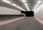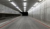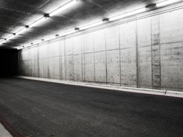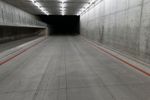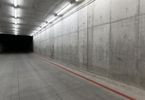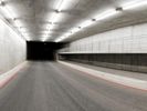 A race track at night, illuminated by bright artificial lights. Concrete streets and tunnels create a straight path for racing. Street lights and dark surroundings add to the intense atmosphere.