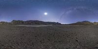 a view across an empty, rocky area under a starry sky over the horizon