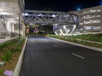 This image captures an empty road in Los Angeles, USA, illuminated by the lights from a nearby pedestrian bridge. The dark night sky creates a low-light atmosphere, emphasizing the artificial light from the street lights and the bridge. The road leads to a residential suburb, with parking lots and parking garages on either side. This photo represents a typical night scene in Los Angeles where people are commuting to work. The city's skyline is visible in the distance, creating a sense of urban life and activity.