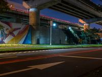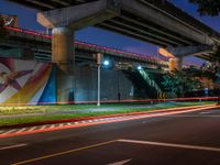 A night scene in Taipei, Taiwan, with light streaks from passing vehicles on a busy road. Graffiti wall illuminated by street lights adds an artistic touch. Clear sky enhances the ambiance of the city.