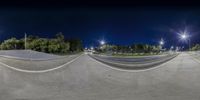skateboarder doing a trick at night with lights behind him of trees and streetlights