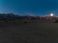 a view of mountains at night with the moon rising above them and a desert area in foreground