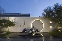 A stone garden in Huailai, China adorned with three black and white sculptures. The modern architecture of the surrounding residential villas and hotels is illuminated by artificial lights. A serene Asian-inspired oasis under a clear night sky.