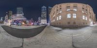 the view from a fish eye lens on the street at night, with multiple images in front