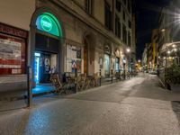 A charming street in Florence, Italy at night. The road is paved with asphalt. The sidewalk is lined with benches and there are people walking down the street. The scene is illuminated by artificial lights, creating a magical atmosphere. In the background, you can see a cozy cafe with outdoor seating and a beautiful garden. This photo captures the romantic ambiance of Florence, a city known for its art, culture, and delicious cuisine. Explore the enchanting streets of Europe and experience the joy of dining out in the open air.
