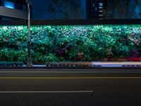 This is an image of an empty street at night in Taiwan, specifically in the cities of Taipei and Taichung. The urban landscape is illuminated by street lights and artificial lights on a wall covered in plants. The dark city streets and urban design create a unique atmosphere. This photo captures the essence of city life in Taiwan, showcasing the bustling streets and the contrast between light and dark. It represents the urban lifestyle and the captivating urban design of Taiwan.