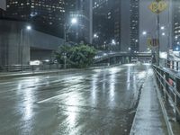 A wet street with a light on at night in an urban area of Los Angeles, California, USA. The modern architecture of the city is reflected on the asphalt road surface, creating a beautiful reflection. The skyline of downtown Los Angeles can be seen in the background, illuminated by artificial lights. The street is empty, giving a serene feeling to the scene. The winter rain has made the road surface wet, creating a shimmering effect. The street is lined with trees, adding a touch of nature to the metropolitan area.