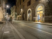A night shot of the streets in Florence, Italy. Classic architecture and artificial lights illuminate the city, creating a magical atmosphere. People walking by add life to the scene. A perfect spot to eat out and enjoy the charming European landscape.