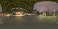 A mesmerizing night scene captured under a bridge in Berlin. The fisheye perspective adds to the urban design and engineering. Artificial lights create captivating tints and shades, enhancing the city's architecture.