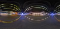 A mesmerizing night scene in downtown Chicago, Illinois. Blurry circles and light trails create an artistic effect on the street. Modern architecture and high-rise buildings reflect in the water. A vibrant and dynamic cityscape.
