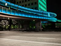 A stunning night view of a walkway near a building with green and blue lights in California, USA. The city skyline is beautifully illuminated, showcasing the architectural beauty of high-rise buildings. The walkway leads to a bridge and underpass, surrounded by tall trees and vibrant vegetation. The street is paved with asphalt, lined with street lights, and bordered by modern office buildings. The clear sky overhead complements the artificial lights, creating a mesmerizing cityscape. This photo captures the essence of urban life in a metropolitan area, offering a glimpse into the bustling city streets and the dynamic business district.