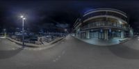 A fish eye view of a metropolitan city at night. The cityscape is illuminated by artificial lights, creating a symmetrical and low-lit scene. A skateboard ramp stands out in the foreground, adding a touch of urban adventure.