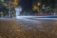 This is an image of a city at night in France. The photo captures the classic architecture and urban design of Paris. The cobblestone road is illuminated by street lights, creating an enchanting atmosphere. The reflection of lights on the water adds to the beauty of the scene. The trees provide a natural element to the urban landscape. This photo represents the vibrant city life in Paris, with its mixture of classic and modern architecture. Experience the charm of Europe in this captivating night shot of Paris.