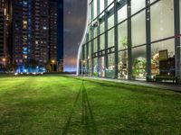 This stunning stock photo captures the vibrant night time atmosphere of a Taiwanese city. In the foreground, you can see an open grassy area, illuminated by artificial lights. Tall modern buildings line the backdrop, creating a captivating urban scene. This cityscape perfectly encapsulates the lively energy of urban life in Taiwan. Whether you're looking to showcase the bustling city streets, the beautiful architecture, or the unique shopping experiences, this image has you covered.