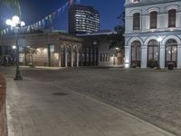 This is an image of a classic architecture in a city at night. The cobblestone road is illuminated by street lights, providing a warm artificial light to the scene. The clear sky above contrasts with the dark surroundings, showcasing the beauty of the cityscape. In the foreground, a plaza is visible, surrounded by buildings including a hotel and restaurant. The surface of the road is smooth, adding to the overall aesthetic of the urban environment. This photo represents a vibrant and inviting night scene in the city.