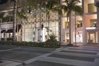 A stunning glass building surrounded by palm trees and city lights at night in Los Angeles, California. The metropolitan area showcases a mix of classic and modern architecture, creating a high-class and sophisticated neighborhood.
