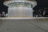 This is a photograph of a modern office building in Toronto, Canada at night. The building features a unique facade with a mixture of architectural styles. The surrounding cityscape is illuminated by street lights and the glare of artificial light. The open space in front of the building serves as a public area with artwork and a bus stop for city dwellers. The night sky is dark and adds to the metropolitan atmosphere of the scene. This image captures the essence of urban life and the vibrant design of Toronto's architecture.