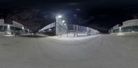 A fisheye lens captures the modern architecture of a building in Toronto's financial district at night. The reflection on the glass facade creates a monochrome effect. Artificial lights illuminate the urban landscape.