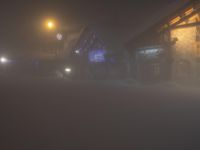 A foggy, cold winter night in a residential area of France. The town lights create an enchanting atmosphere. The Alps in the background add to the picturesque scene. A perfect setting for a charming European winter night.