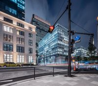 a street view with some buildings around it in the city at night time, and a traffic light