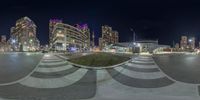 a night time picture of the buildings and street lights in an urban area, with a fish eye lens effect