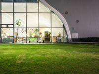 This is an image of a modern city in Taiwan, specifically in the cities of Taipei and Taichung. The photo captures the city's vibrant urban atmosphere at night, with illuminated storefronts and street lights. In the foreground, there is a green open space featuring a grass surface and various plants. The architecture of the city reflects a combination of modern designs and traditional elements. This image represents the bustling city life of Taiwan, where urban design and architecture blend seamlessly with nature.