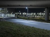 an empty street in an urban setting lit up at night under the highway overpass