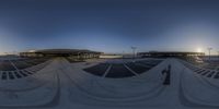 A night view of an airport parking garage, illuminated by street lights and the glow of the city. The composite material facade and rectangle windows create a modern architectural design. People can be seen at the end of the garage, adding life to the scene.